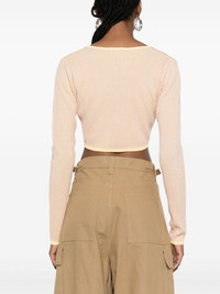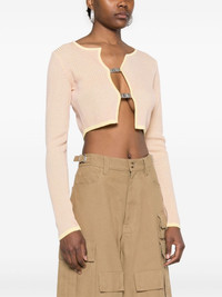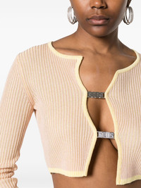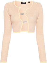 Comma ribbed cropped cardigan Highlights - Salmon pink - Yellow - Ribbed knit - Contrasting trim - Silver-tone logo plaque to the front - Round neck - Long sleeves - Cropped - Front clip fastening - Straight hem - Unlined Made in Italy Composition Viscose 75%, Polyester 25% SIZE & FIT Model measurements Height 5 ft 11 in(1.8 m) Bust/Chest 31.49 in(80 cm) Hips 36.61 in(93 cm) Waist 24.4 in(62 cm) FittingInformation Designed for a slim fit that sits just away from the body offering a close yet comfortable fit Made with a midweight knit, this piece offers some stretch This piece fits true to size – take your usual size