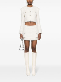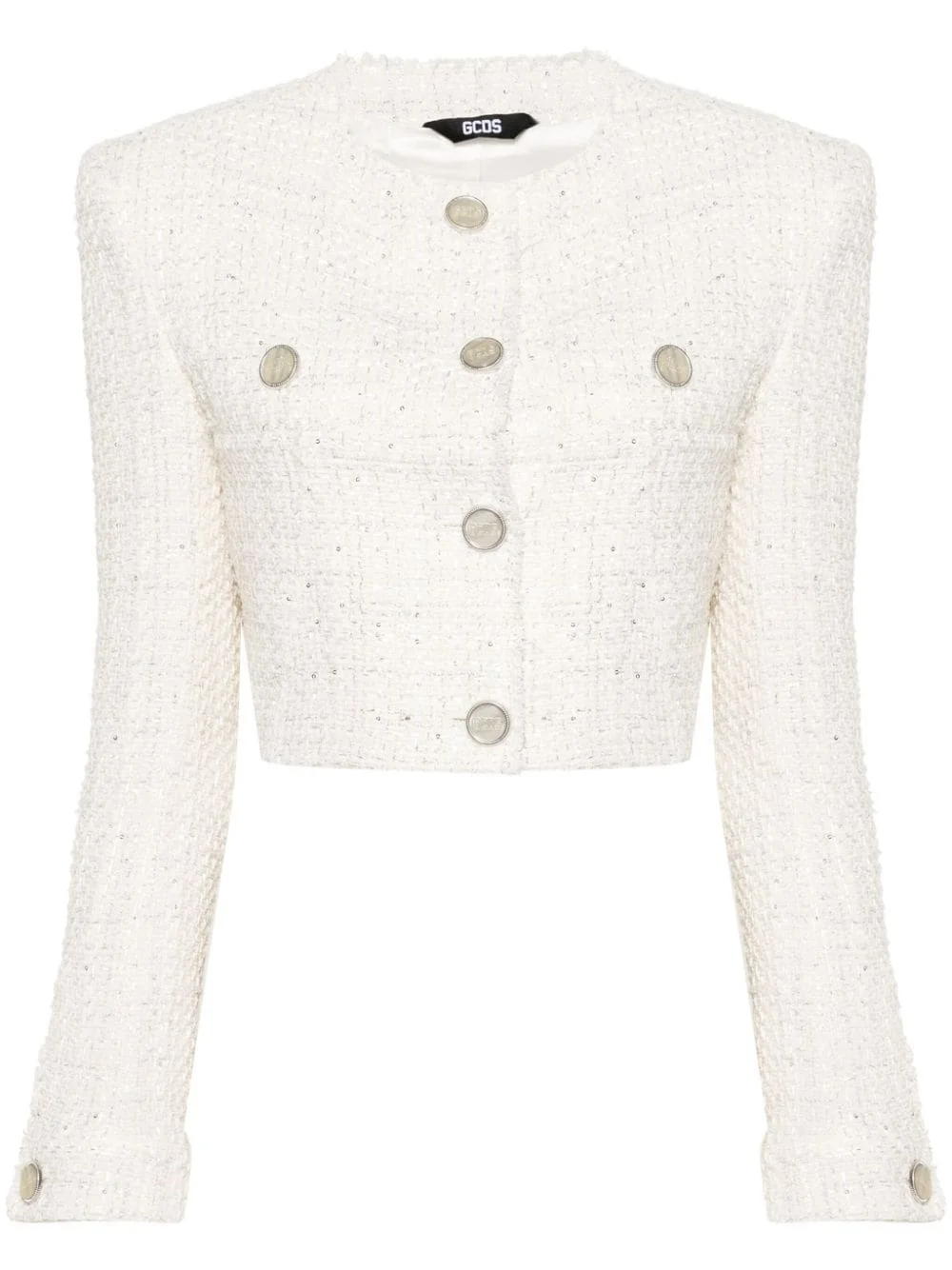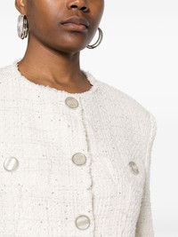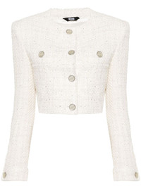 cropped tweed jacket Highlights - Off-white - Cotton blend - Metallic threading - Tweed - Sequin embellishment - Logo-debossed buttons - Collarless - Round neck - Shoulder pads - Buttoned cuffs - Two chest welt pockets - Cropped - Front button fastening - Straight hem - Logo-jacquard lining Made in Italy Composition Outer: Cotton 62%, Polyester 28%, Other fibres 10% Lining: Viscose 100% SIZE & FIT Model measurements Height 5 ft 11 in(1.8 m) Bust/Chest 31.49 in(80 cm) Hips 36.61 in(93 cm) Waist 24.4 in(62 cm) FittingInformation Designed for a slim fit that sits just away from the body offering a close yet comfortable fit The internal shoulder pads offer a structured shape Made from a midweight non-stretch fabric This piece fits true to size – take your usual size Washing instructions Dry Clean Only