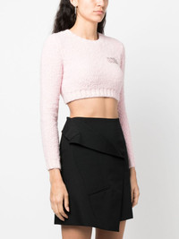 crystal-embellished crew-neck crop top Highlights - Light pink - Knitted construction - Crystal embellishment - Logo embellishment - Crew neck - Long sleeves - Ribbed cuffs and hem - Straight hem - Cropped Made in Italy Composition Acrylic 45%, Virgin Wool 25%, Alpaca Wool 25%, Polyamide 5% SIZE & FIT Model measurements Height 5 ft 9 in(1.75 m) Bust/Chest 33.07 in(84 cm) Hips 35.03 in(89 cm) Waist 24.01 in(61 cm) FittingInformation Designed for a slim fit that sits just away from the body offering a close yet comfortable fit Cropped in length Made with a midweight knit, this piece offers some stretch This piece fits true to size – take your usual size
