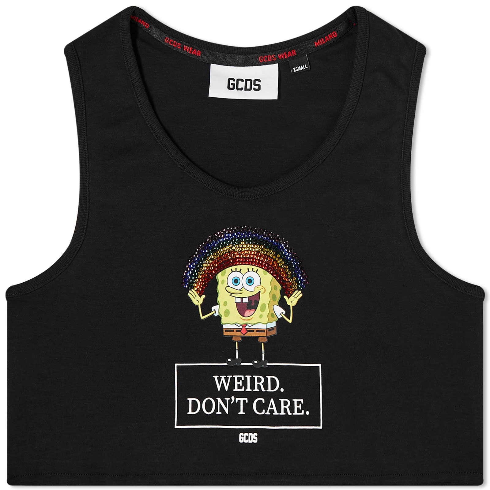 Embrace your weird side with a helping hand from everyone’s favourite sponge and GCDS’ SS23 collaboration with Spongebob Squarepants himself. This cropped cut continues the brand’s mission to revolutionise streetwear with pop culture influences and a colourful palette that’s only exemplified with a studded rainbow here. - 100% Cotton - Cut Cropped - Printed Branding - Made in Portugal