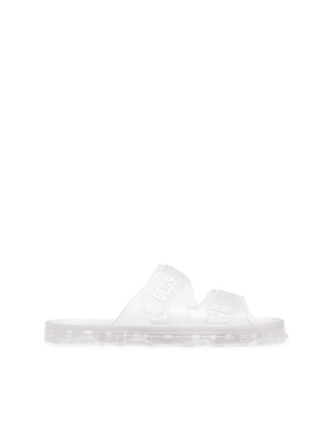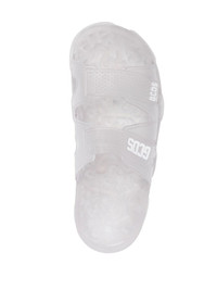 logo-detail open-toe slides white transparent design embossed logo to the side open toe branded insole moulded footbed flat rubber sole slip-on style Imported Composition PVC 100% SIZE & FIT Measurement HEEL 0.59 in(1.5 cm)