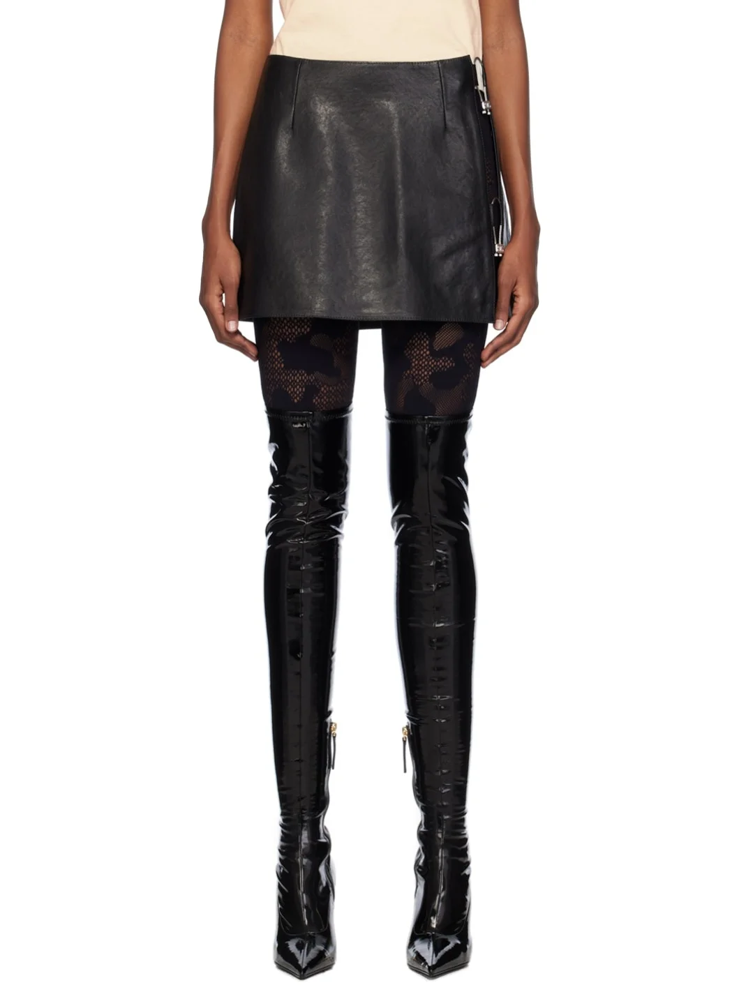 Grained leather skirt. · Logo hardwares at open side seam · Zip closure at side · Full viscose satin lining Supplier color: Nero Body: 100% leather. Lining: 100% viscose. Made in Italy 241308F090001