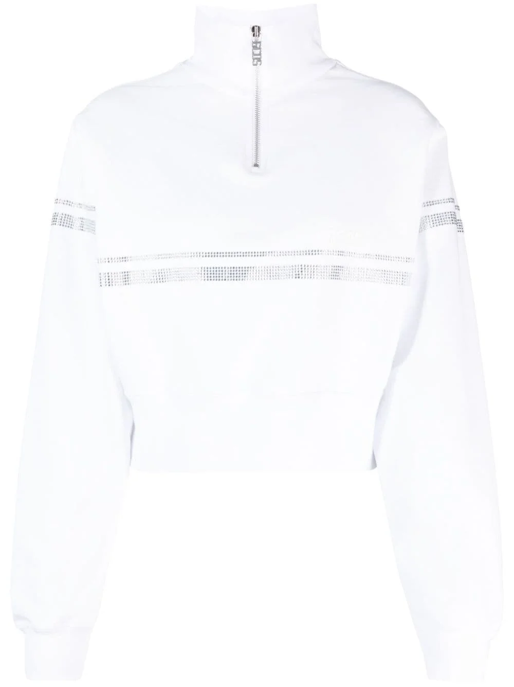 rhinestone-embellished cropped sweatshirt Highlights - White - Cotton - Logo print at the chest - Rhinestone embellishment - Horizontal stripe pattern - High neck - Short front zip fastening - Long sleeves - Straight hem - Straight hem Made in Italy Composition Cotton 100% SIZE & FIT Model measurements Height 5 ft 10 in(1.78 m) Bust/Chest 31.49 in(80 cm) Hips 37 in(94 cm) Waist 23.62 in(60 cm) FittingInformation Designed for a relaxed fit, this piece allows for comfort and movement when worn Made from a midweight non-stretch fabric, this piece offers minimal elasticity when worn This piece fits true to size – take your usual size Washing instructions Machine Wash