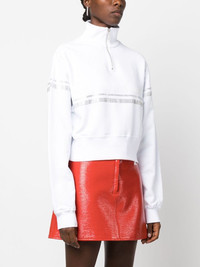 logo-print crystal-embellished sweatshirt Highlights - White - Cotton - Glitter detailing - Logo print to the front - Crystal embellishment - Funnel neck - Half front zip fastening - Long sleeves - Straight hem Made in Italy Composition Cotton 100% SIZE & FIT Model measurements Height 5 ft 10 in(1.78 m) Bust/Chest 31.49 in(80 cm) Hips 37 in(94 cm) Waist 23.62 in(60 cm) FittingInformation Designed for a relaxed fit, this piece allows for comfort and movement when worn Cropped in length Made from a midweight non-stretch fabric, this piece offers minimal elasticity when worn This piece fits true to size – take your usual size Washing instructions Machine Wash