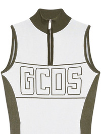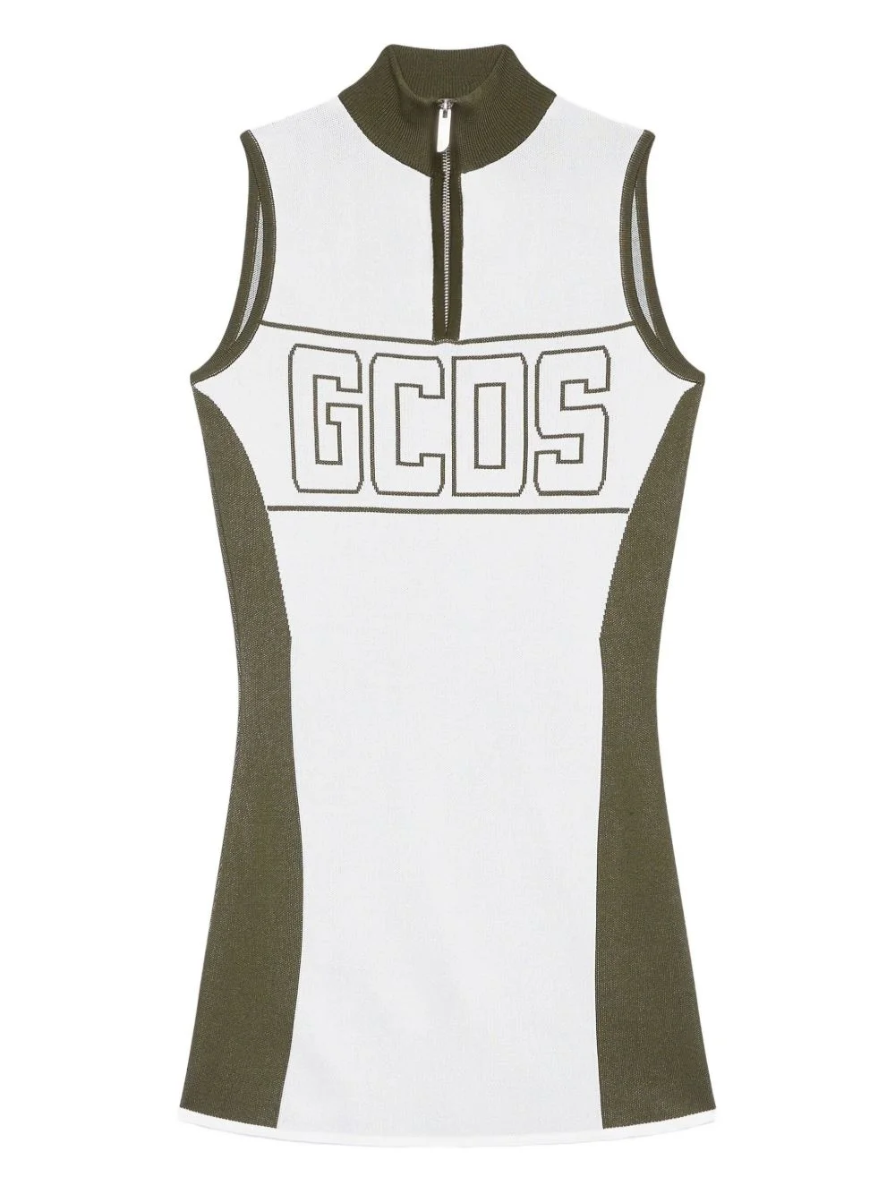 logo-print mini dress Highlights - Olive green - Short front zip fastening - Two-tone design - Sleeveless - Straight hem Made in Italy Composition Viscose 65%, Polyamide 35%