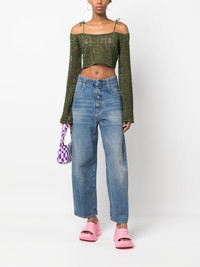 off-shoulder macrame crop top Highlights - Khaki - Semi-sheer construction - Metallic threading - Macrame detailing - Off-shoulder - Shoulder tie fastening - Long sleeves - Cropped Made in Italy Composition Viscose 70%, Polyester 15%, Metallic Fibre 15% SIZE & FIT Model measurements Height 5 ft 11 in(1.8 m) Bust/Chest 31.88 in(81 cm) Hips 35.03 in(89 cm) Waist 24.01 in(61 cm) FittingInformation Designed for a slim fit that sits just away from the body offering a close yet comfortable fit The adjustable shoulder straps allow for a preferred fit when worn Made with a midweight knit, this piece offers some stretch This piece fits true to size – take your usual size