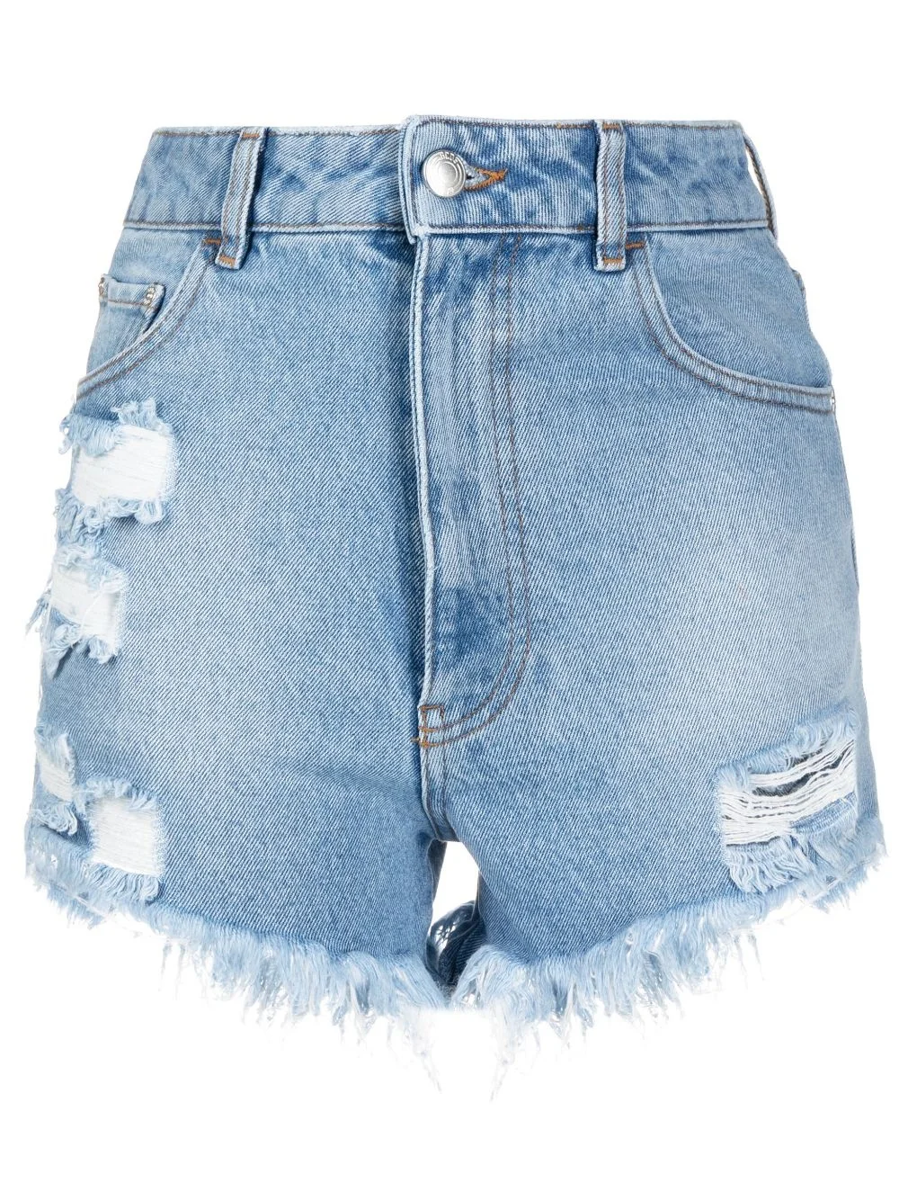 ripped denim shorts light blue cotton high waist belt loops front button and zip fastening classic five pockets frayed edge Made in Italy Composition Outer: Cotton 100% Lining: Polyester 65%, Cotton 35% SIZE & FIT Model measurements Height 5 ft 11 in(1.8 m) Bust/Chest 31.49 in(80 cm) Hips 36.61 in(93 cm) Waist 24.4 in(62 cm) FittingInformation This piece fits small – you might want to get one size up Cut for a slim fit Made with a mid-weight non-stretch fabric Washing instructions Machine Wash