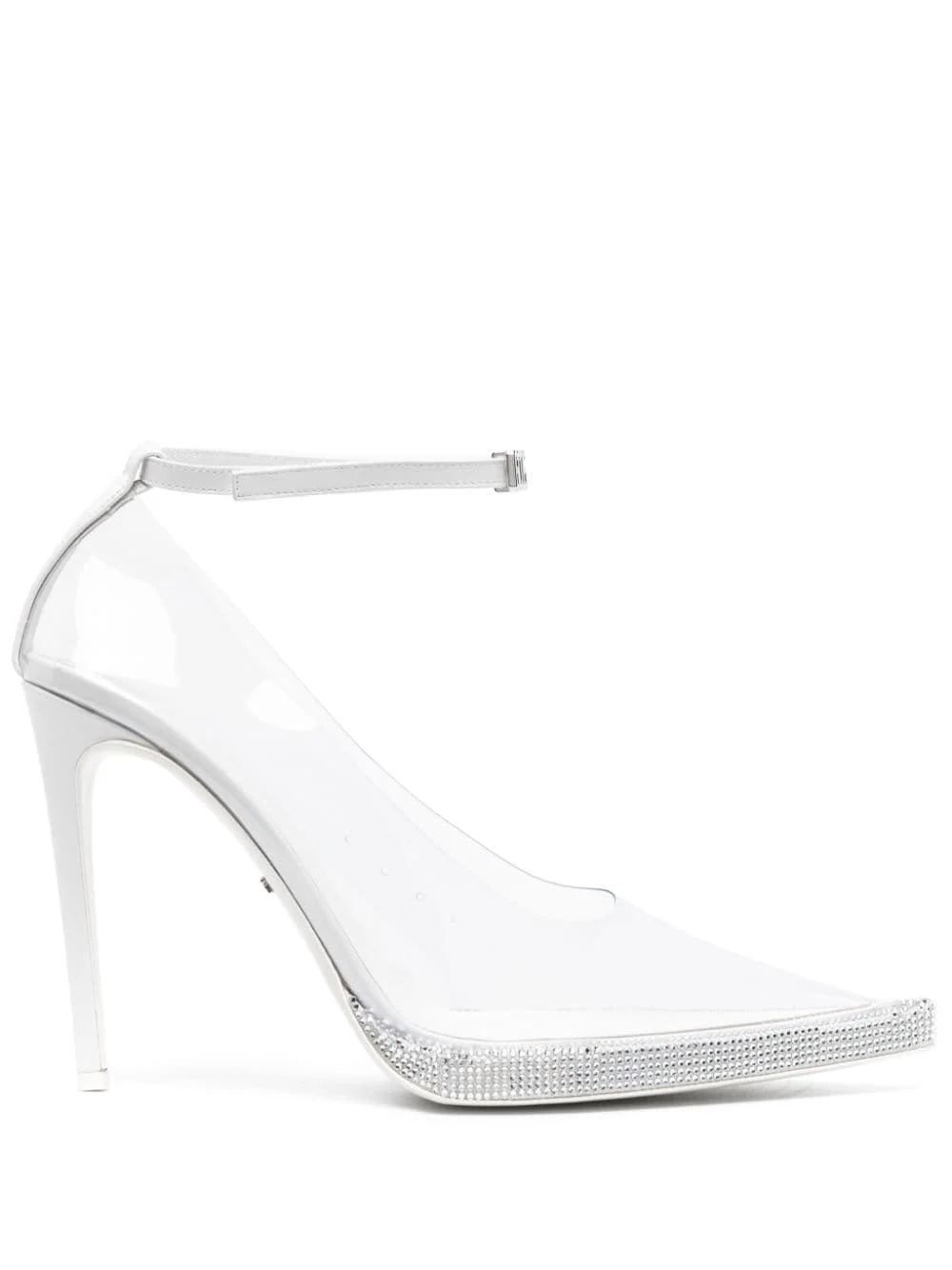 Transpallic Rider 130mm pumps Highlights - Optical white - Calf leather - Transparent panel detail - Crystal embellishment - Pointed toe - Buckle-fastening ankle strap - Branded leather insole - High stiletto heel Made in Italy Composition Other fibres 100% SIZE & FIT Measurement HEEL 5.11 in(13 cm) Sole height 0.59 in(1.5 cm)