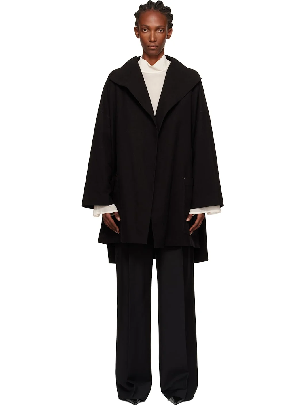 Stretch cotton moleskin coat. · Shawl lapel · Open front · Patch pockets at waist · Droptail hem · Vented side seams · Dropped shoulders · Full satin lining Supplier color: Black 98% cotton, 2% polyurethane. Made in Viet Nam 252749F059005