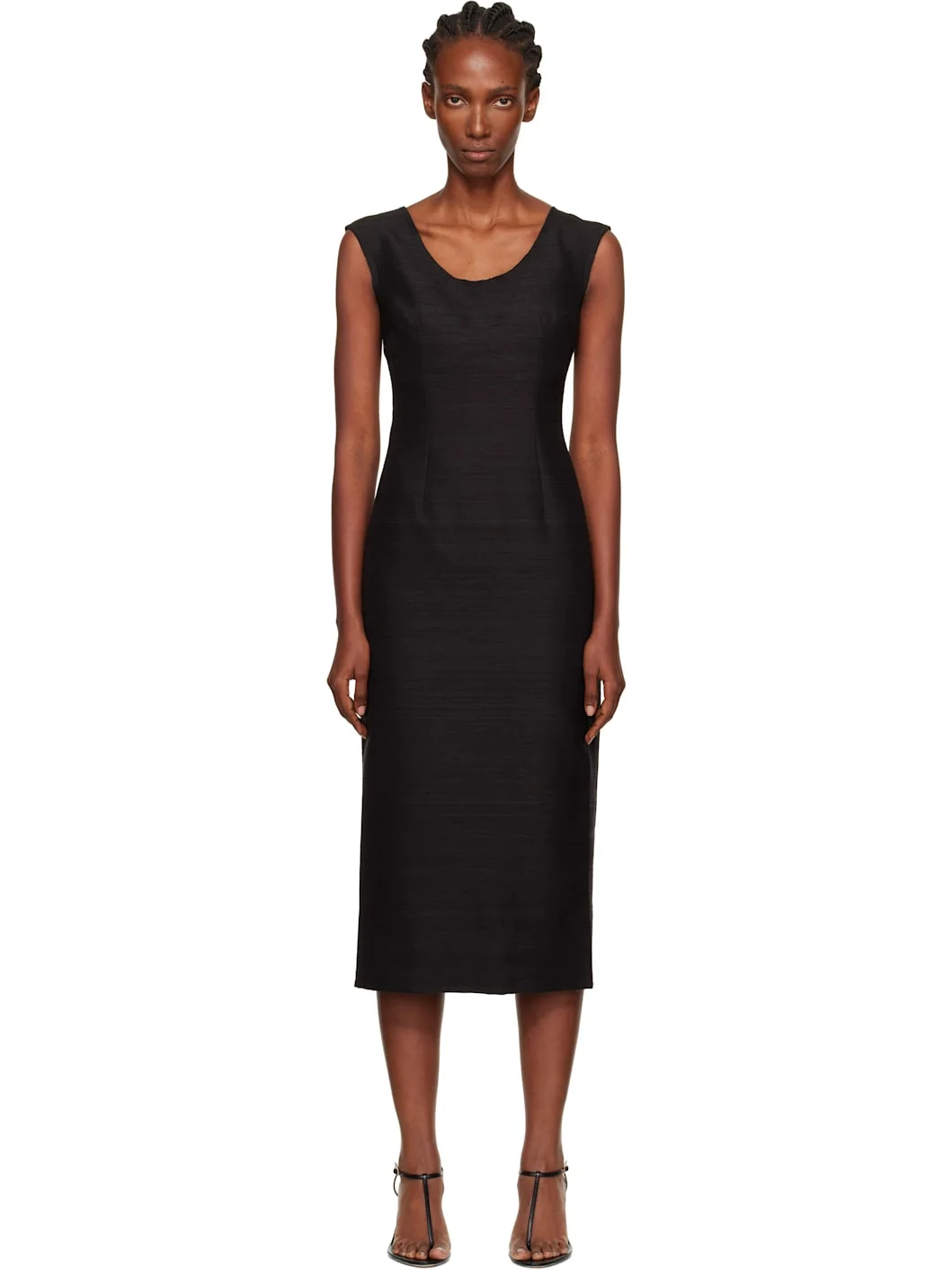 Silk faille midi dress. · Raw edges throughout · Scoop neck · Darts at chest and front · Seam pockets at waist · Zip closure at back · Vent at back hem Supplier color: Black 100% silk. Made in Viet Nam 252749F054003