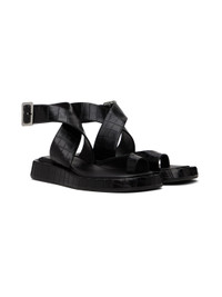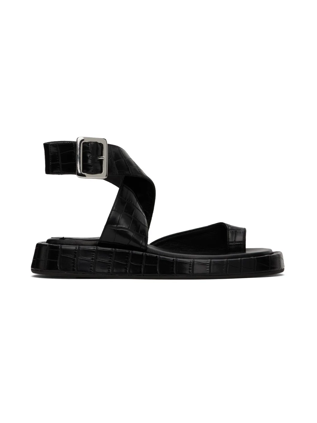 Croc-embossed faux-leather flat sandals in black. · Open square toe · Wraparound pin-buckle ankle strap · Logo embossed at padded leather footbed · Covered midsole · Rubber sole Supplier color: Black Upper: synthetic. Sole: rubber. Made in Italy 241671F124003