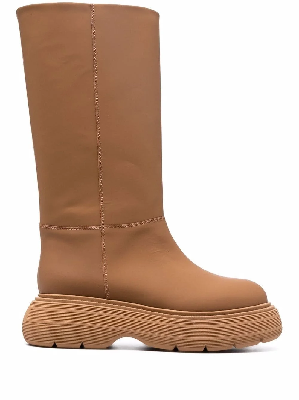 chunky sole leather boots brown leather knee-length round toe chunky rubber sole slip-on style Made in Italy Composition Leather 100% SIZE & FIT Measurement CIRCUMFERENCE 14.96 in(38 cm) HEEL 2.36 in(6 cm) HEIGHT 12.2 in(31 cm) PLATFORM 1.57 in(4 cm)