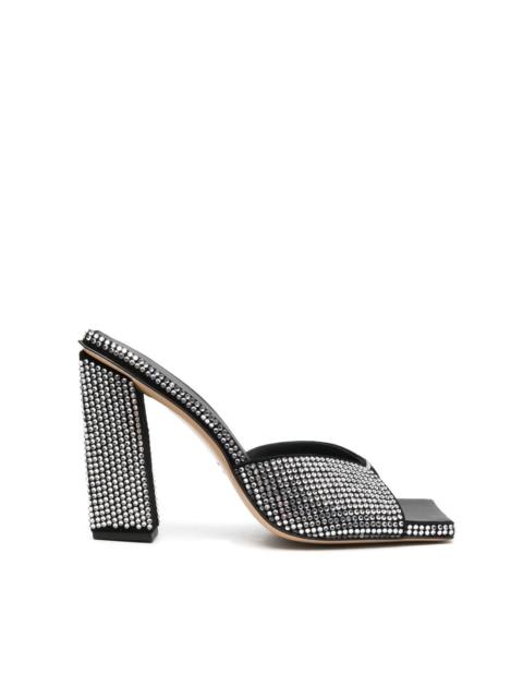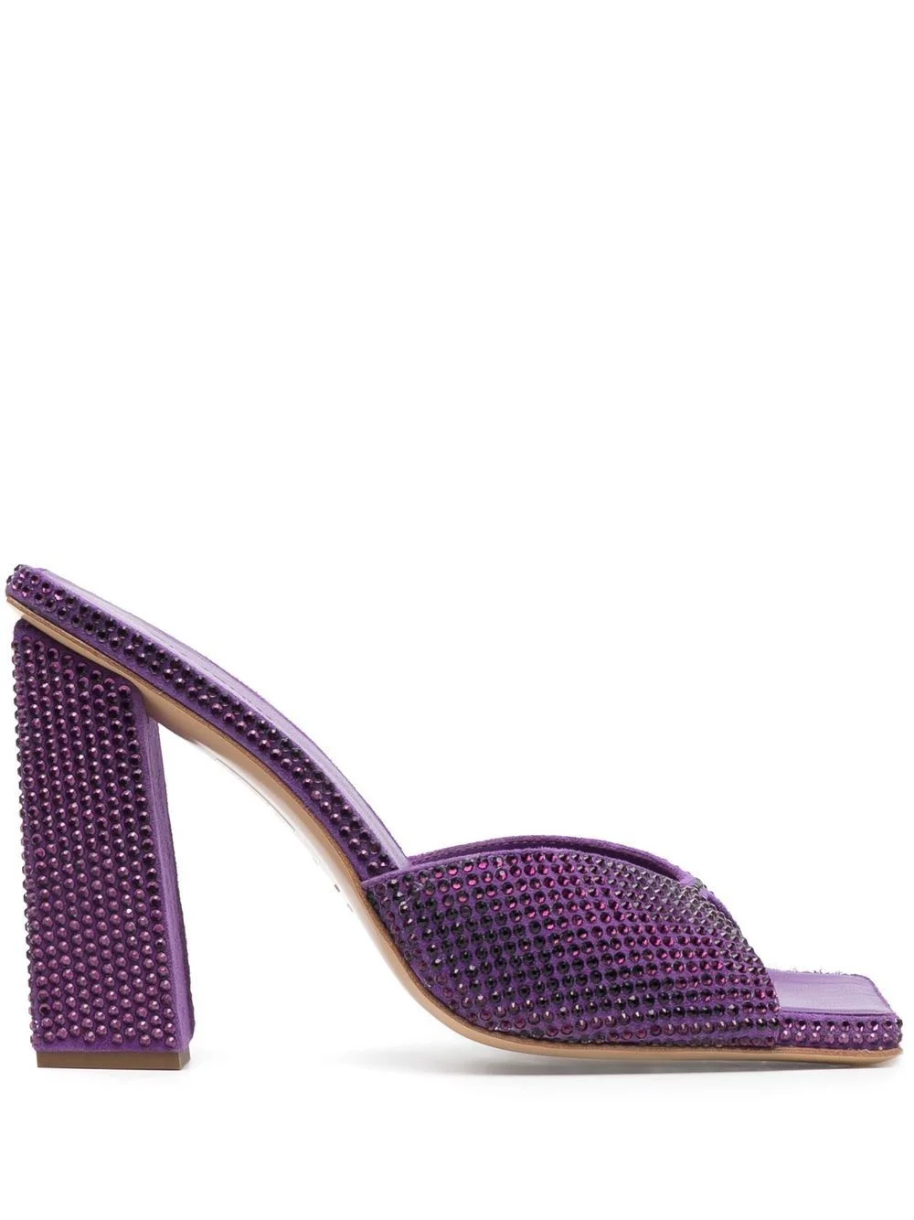 glass-crystal embellished sandals Highlights - Electric purple - Calf leather - Glass crystal embellishment - Open toe - Backless - Block heel - 100mm heel Made in Italy Composition Suede 100% SIZE & FIT Measurement HEEL 3.93 in(10 cm) Sole height 0.39 in(1 cm)