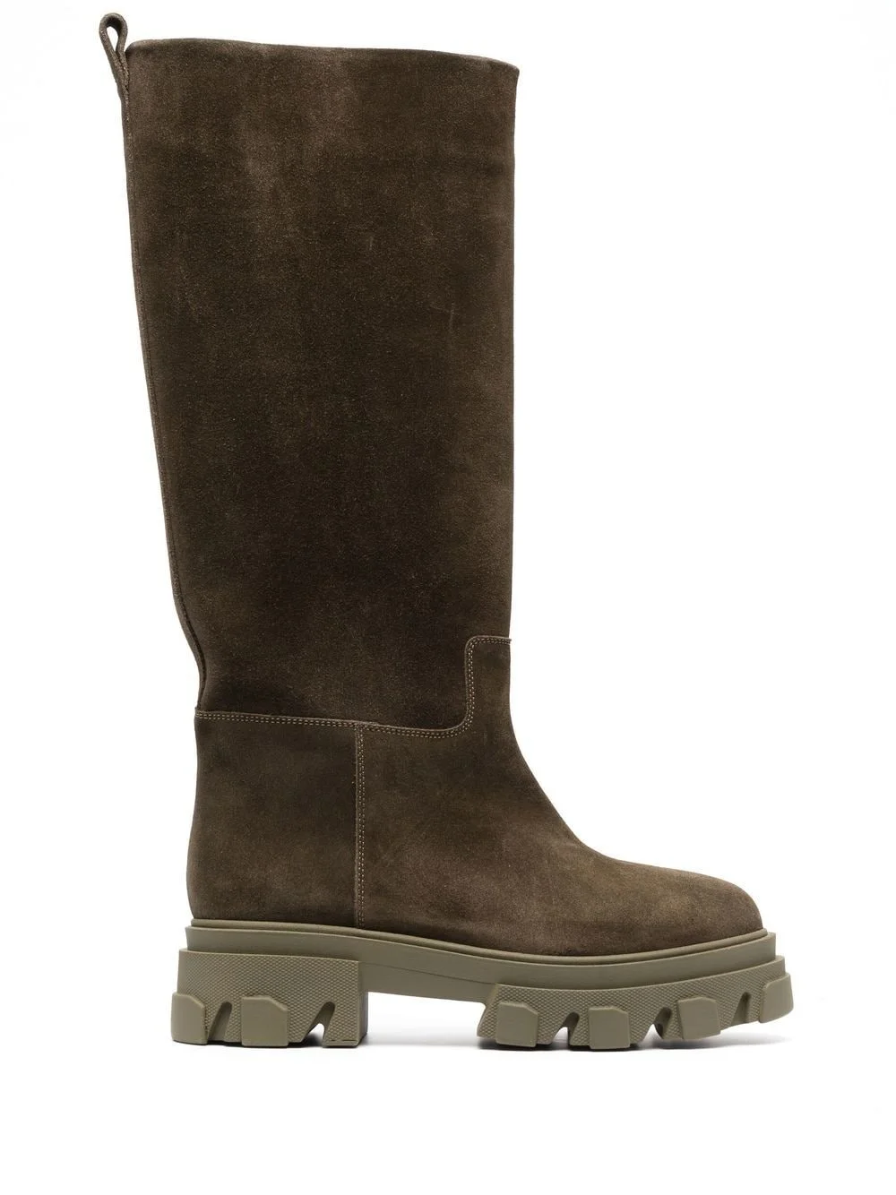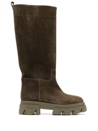 knee-length suede boots mud brown/khaki calf leather pull-on style knee-length almond toe ridged rubber sole Made in Italy Composition Leather 100% SIZE & FIT Measurement CIRCUMFERENCE 14.17 in(36 cm) HEEL 2.75 in(7 cm) HEIGHT 15.35 in(39 cm) PLATFORM 1.57 in(4 cm)