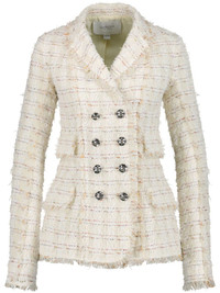 boucle double-breasted blazer Rendered in a soft light beige hue, this Giambattista Valli blazer boasts a boucle construction, reflecting the brand's romantic aesthetic. The double-breasted silhouette pays homage to classic tailoring design. Highlights - Light beige - Boucle construction - Fringed edge - Double-breasted button fastening - Four front flap pockets - Long sleeves - Straight hem Made in Italy Composition Wool 42%, Cotton 27%, Polyamide 14%, Polyester 11%, Polyurethane 3%, Acrylic 3% Washing instructions Dry Clean Only