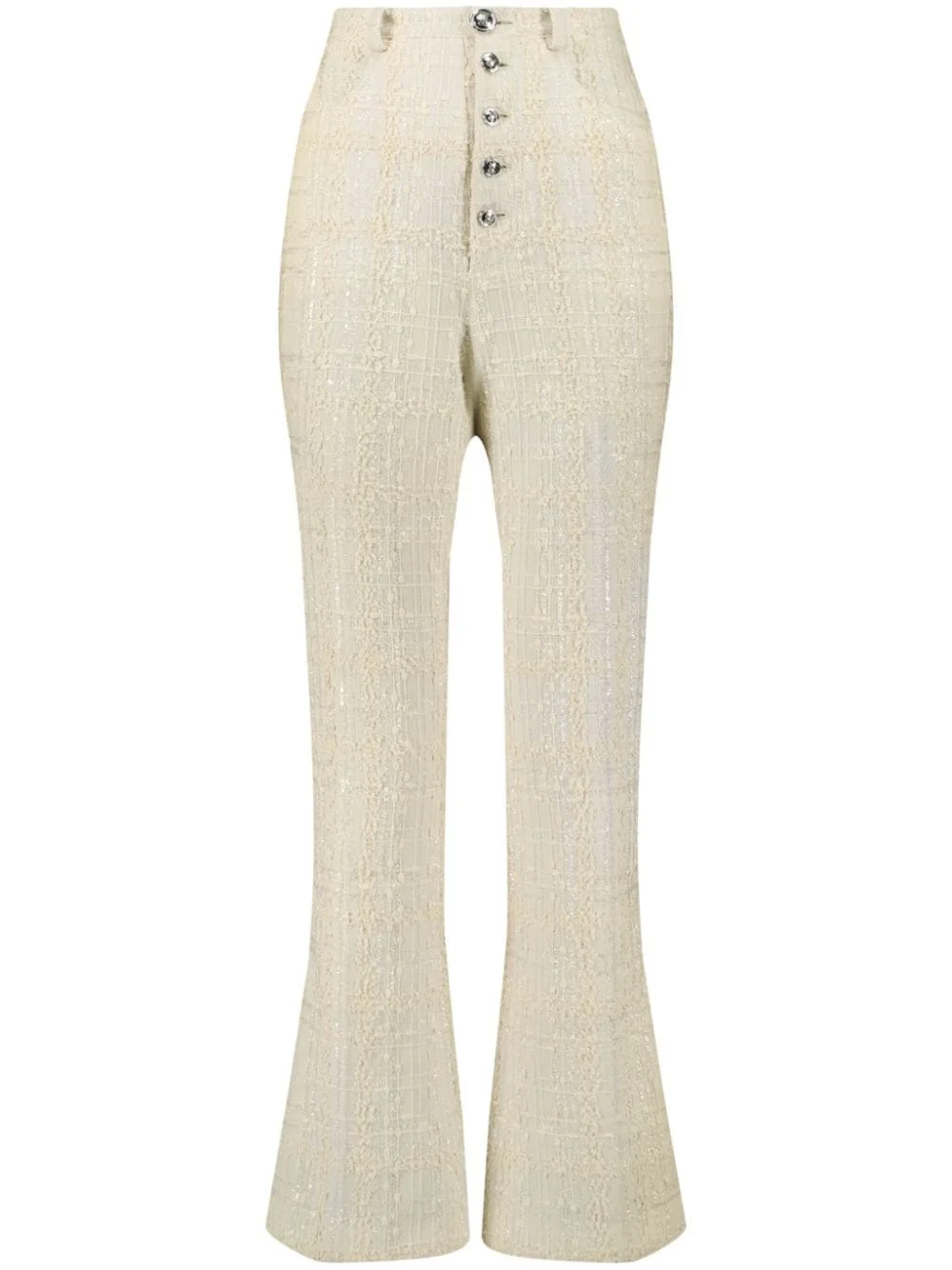boucle high-waisted flared trousers Rendered in a light shade of beige and elevated with light-catching metallic fibre for added dimension, these trousers from Giambattista Valli are woven into a classic boucle construction. The pair sits high at the waist for an elongating silhouette. Highlights - Beige - Boucle construction - Metallic threading - High-waisted - Belt loops - Button fly fastening - Classic five pockets - Flared Imported Composition Polyester 87%, Metallic Fibre 13% Washing instructions Dry Clean Only