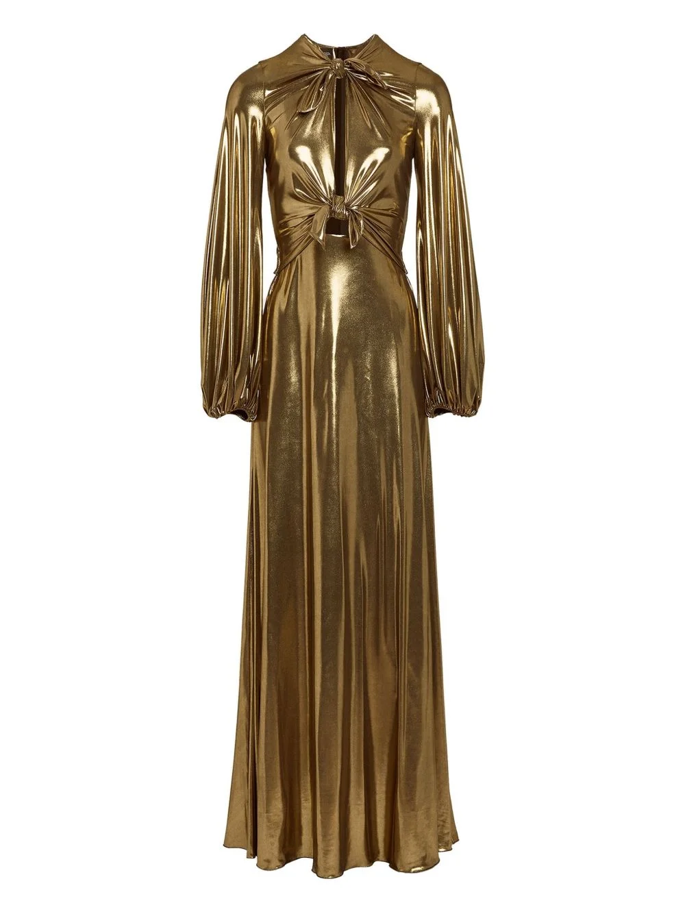 bow-detail maxi dress Highlights - Gold - Long sleeves - Keyhole neckline - Waist tie - A-line skirt Made in Italy Composition Polyester 95%, Elastane 5% Washing instructions Read Manufacturer Guidelines