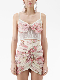 bow-embellished bralette top Nodding to lingeries styles, this Giambattista Valli bralette top is designed with a corset-like base decorated with floral lace panelling. The look is complete with an enveloping floral-printed sash, tied at the front in an oversized bow. Made in Italy Composition Top: Silk 100% Washing instructions Dry Clean Only