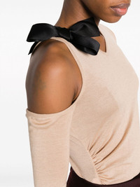 bow-embellished cut-out top Giambattista Valli's silk-cashmere top is a testament to the brand's affinity for romantic detailing. A black velvet bow details one shoulder, adding an unexpected twist to the sotly ruched silhouette. Highlights - Camel brown - Cashmere-silk blend - Bow detailing - Ruched detailing - V-neck - Cut-out detailing - Long sleeves Made in Italy Composition Cashmere 70%, Silk 30% SIZE & FIT Model measurements Height 5 ft 11 in(1.8 m) Bust/Chest 31.88 in(81 cm) Hips 35.03 in(89 cm) Waist 24.01 in(61 cm) FittingInformation Designed for a slim fit that sits just away from the body offering a close yet comfortable fit Made with a lightweight knit, this piece offers some stretch This piece fits true to size – take your usual size Washing instructions Dry Clean Only