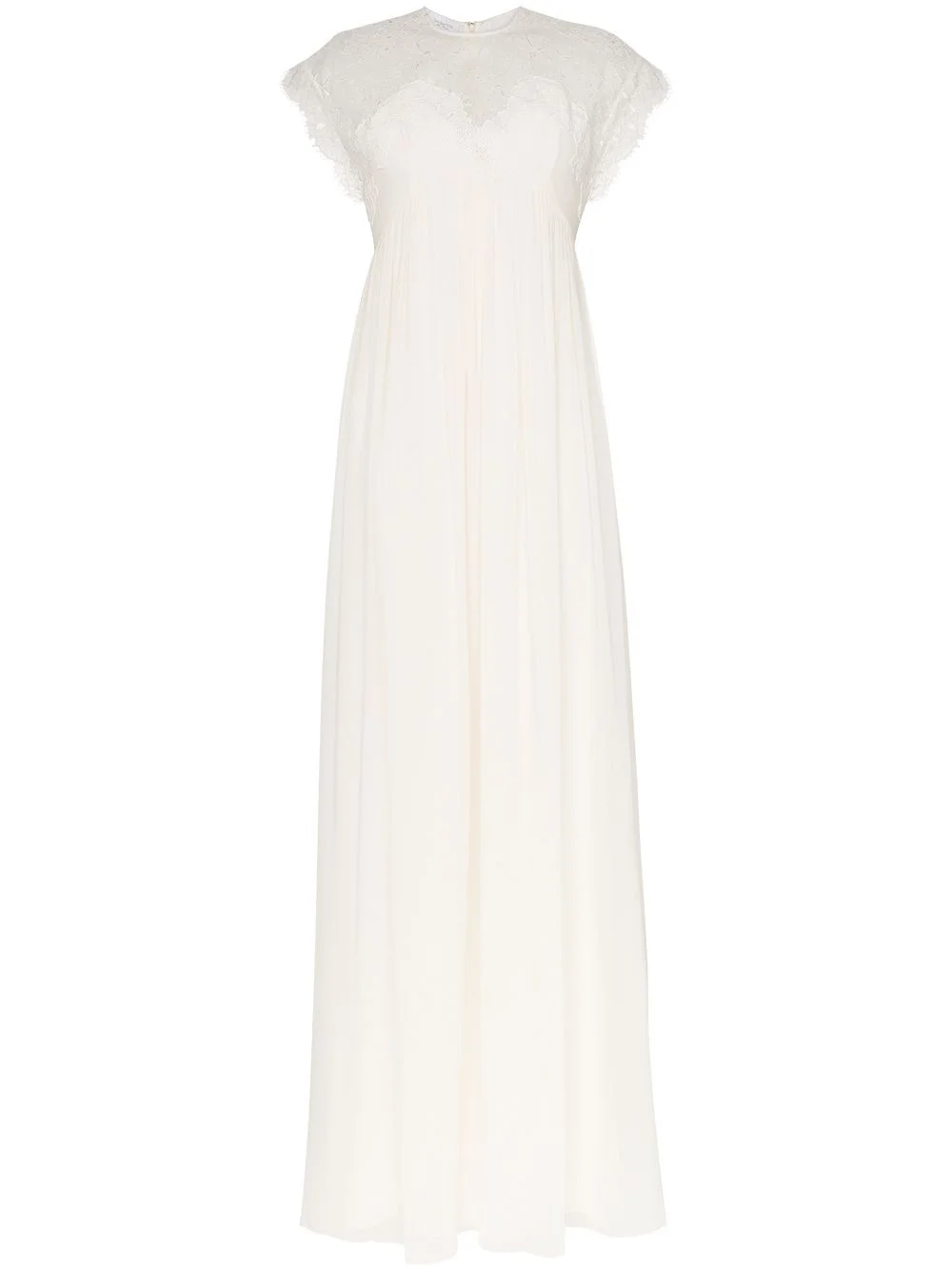 cap sleeve lace insert empire line maxi dress Taking inspiration from intricate interiors and elaborate decor, Giambattista Valli is renowned for its sumptuous gowns that can transform a woman’s persona. This white silk lace-insert long dress from Giambattista Valli features a round neck, a rear zip fastening, cap sleeves with a scalloped hem, a lace chest and back and an empire silhouette. Made in Italy Composition Lining: Viscose 65%, Polyamide 35% Outer: Silk 100% SIZE & FIT Model measurements Height 5 ft 10 in(1.78 m) Bust/Chest 33.85 in(86 cm) Hips 34.25 in(87 cm) Waist 24.01 in(61 cm) Washing instructions Dry Clean Only