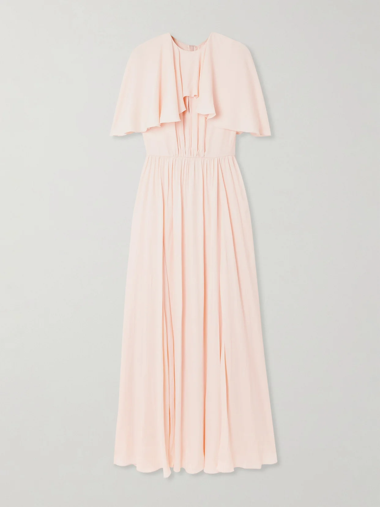 Giambattista Valli's dress is made from pleated crepe and has a fluttery cape-effect panel that rests on the shoulders. It has a fitted waist and floaty skirt and comes in a pretty 'Quartz Rose' shade.