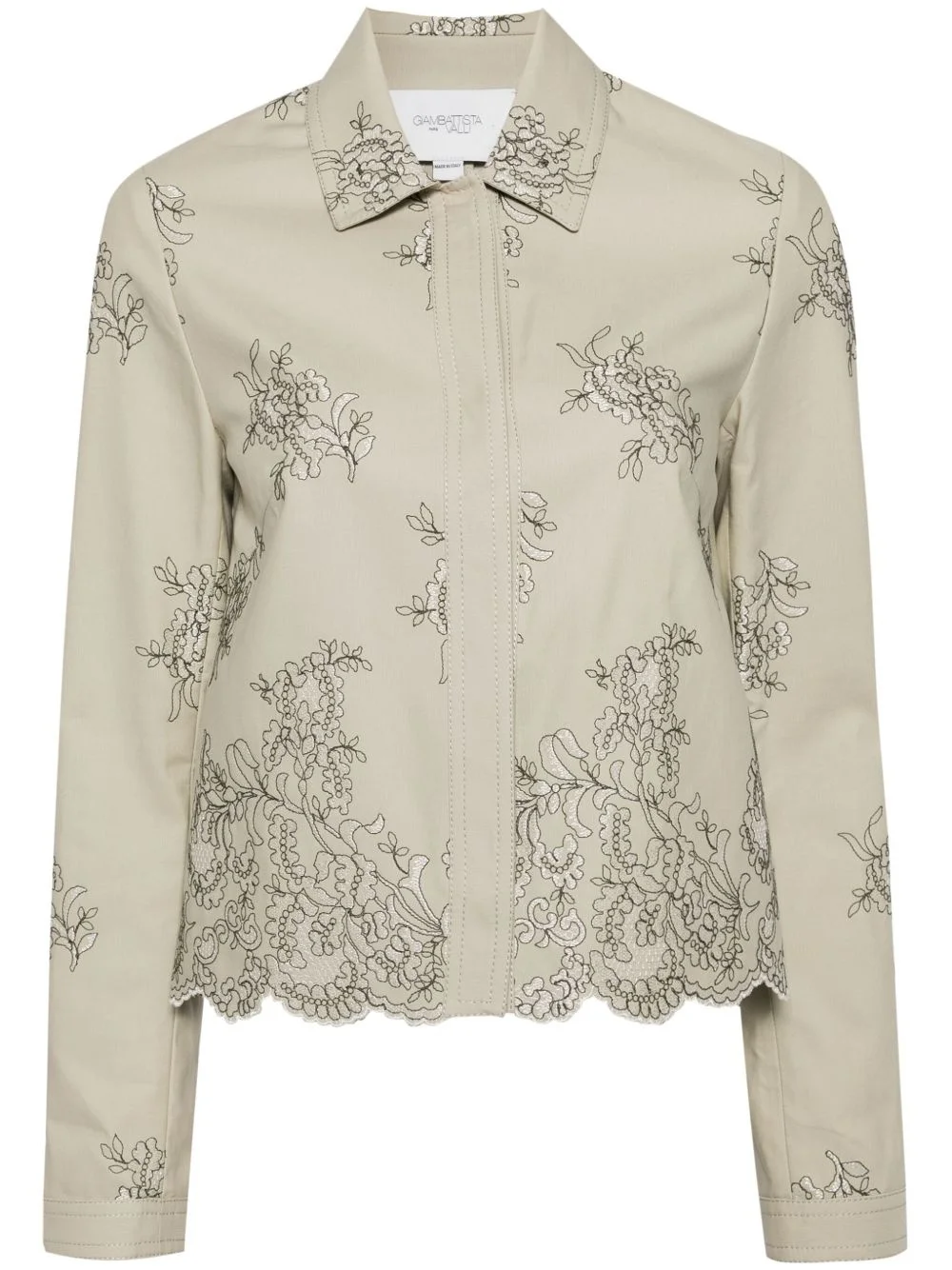 floral-embroidered twill shirt Highlights - Beige - Cotton blend - Twill weave - All-over floral embroidery - Tonal stitching - Classic collar - Concealed front fastening - Long sleeves - Scallop hem Made in Italy Composition Cotton 50%, Viscose 40%, Polyester 10%