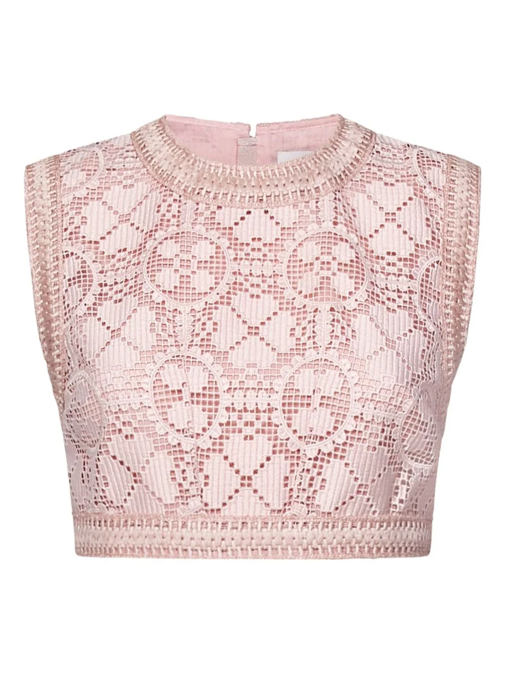 crochet lace top Highlights - Light pink - Intricate crochet lace design - Round neckline - Sleeveless - Back zip fastening Made in Italy Composition Polyester 100% Washing instructions Read Manufacturer Guidelines