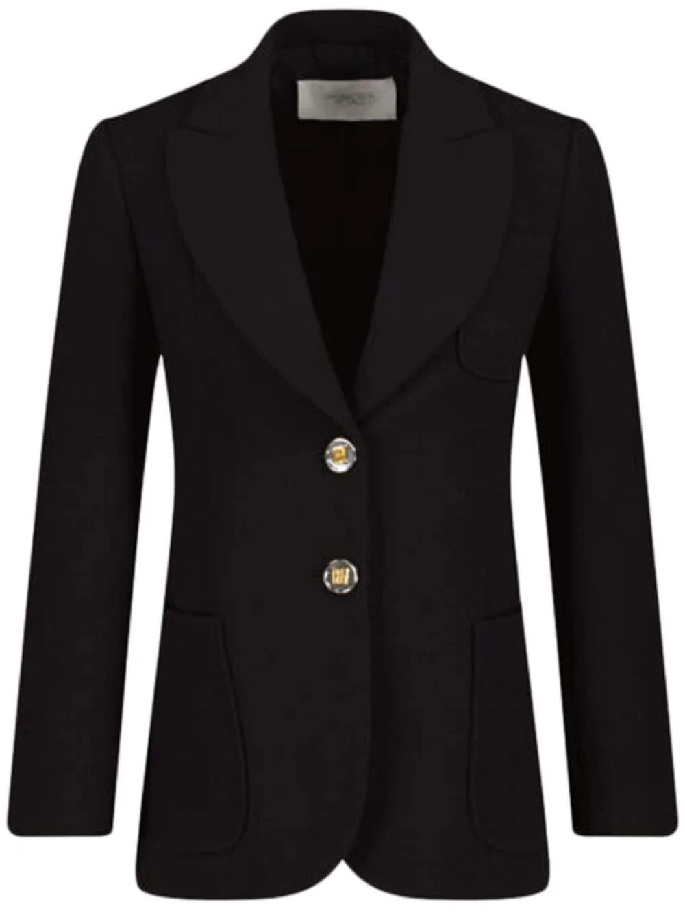 embossed-buttons single-breasted blazer Highlights - Black - Stretch-design - Logo-embossed buttons - Peak lapels - Front button fastening - Long sleeves - Chest patch pocket - Two front patch pockets Made in Italy Composition Viscose 97%, Elastane 3%