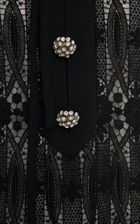 PRODUCT DETAILS - Featured in the Pre-Fall 2024 Lookbook - Slim fit, sheath silhouette, crew neck with tie detail, sleeveless, button details, lace-edge hemline - Lined - Composition: 90% Cotton, 10% Polyester - Color: black - Concealed zip fastening along back - Made in Italy