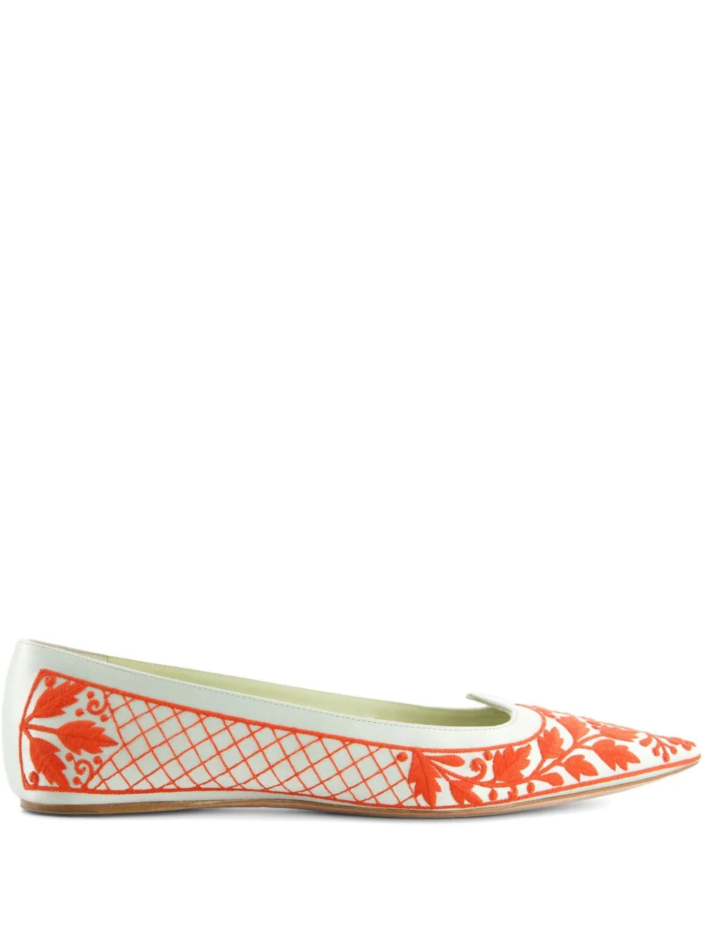 embroidered pointed ballet flats Highlights - White and orange - Embroidered - Pointed toe - Flat sole Made in Italy Composition Outer: Calf Leather 100%, Viscose 72%, Silk 28% Lining: Calf Leather 100% Sole: Calf Leather 100%