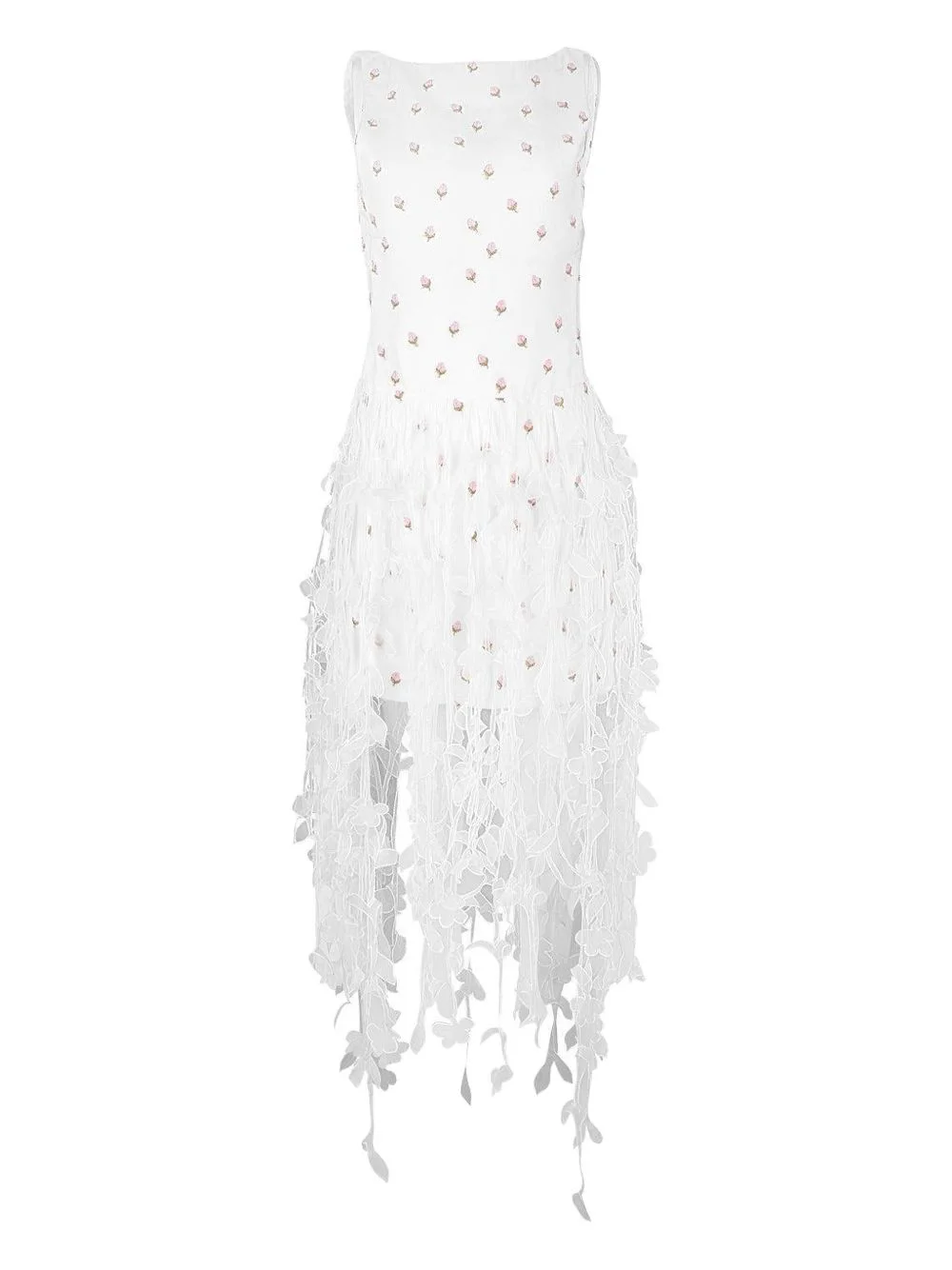 floral-applique midi dress Highlights - Off-white - Floral embroidery - Ruffled tiered skirt - Sleeveless - Open back - Asymmetrical hemline Made in Italy Composition Viscose 100% Washing instructions Read Manufacturer Guidelines