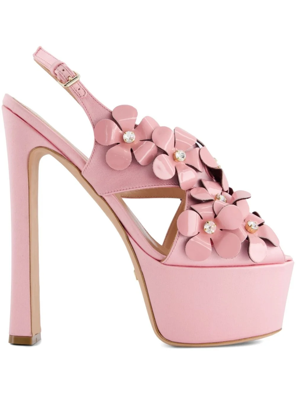 floral-applique sandals Highlights - Bubblegum pink - Buckle-fastening slingback strap - Crystal embellishment - Cut-out detailing - High block heel Made in Italy Composition Lining: Calf Leather 100% Outer: Satin 100%, Leather 100% Sole: Calf Leather 100%