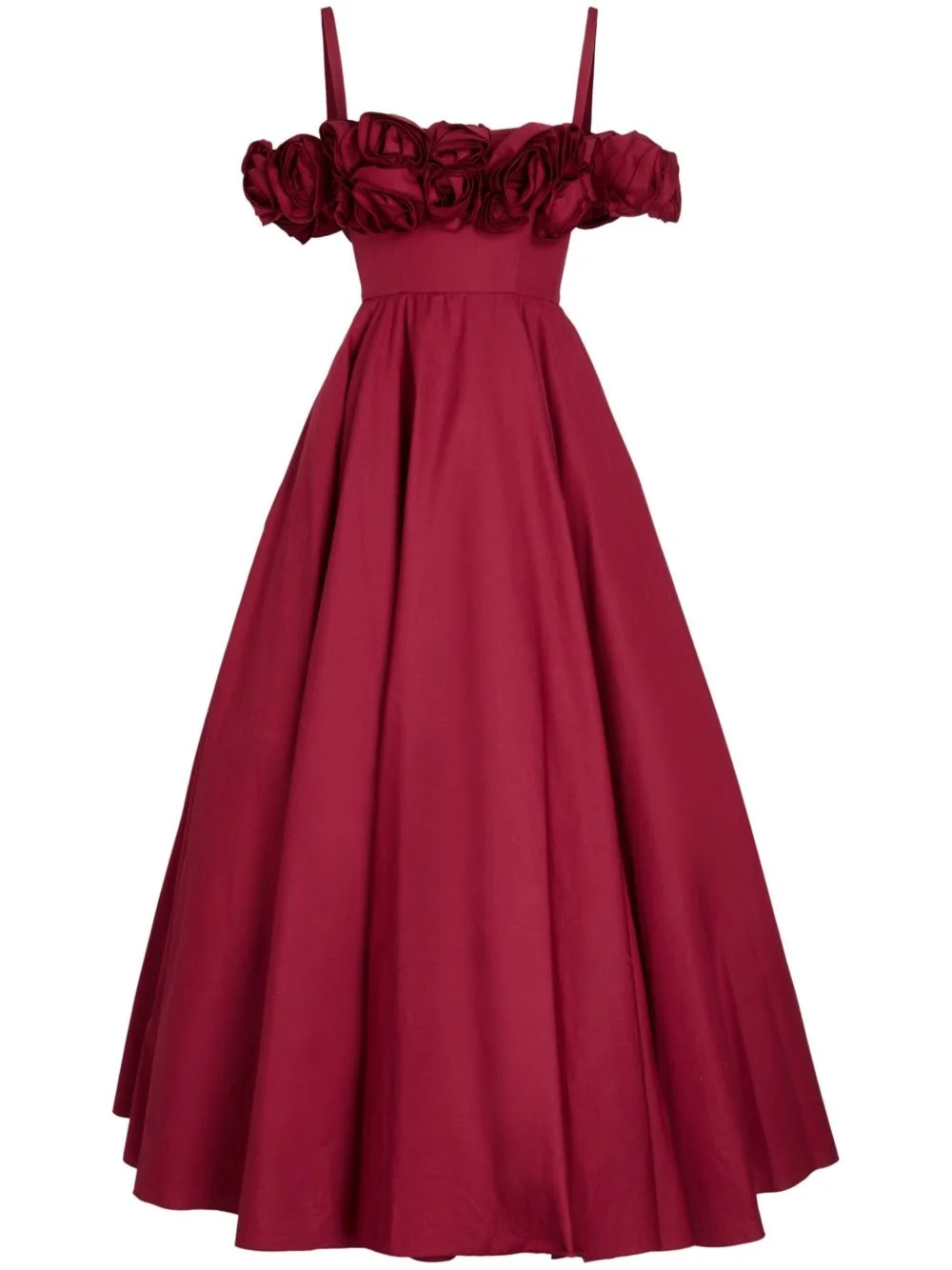 floral bustier gown Giambattista Valli's gown is appliqued with floral detailing at the bustier neckline before falling to a flared silhouette. Highlights - Red - Cotton - Floral detail - Bustier-style neckline - Square neck - Off-shoulder - Concealed rear zip fastening - Flared skirt - Floor-length Made in Italy Composition Cotton 100% SIZE & FIT Measurement HIPS 38.58 in(98 cm) LENGTH 60.23 in(153 cm) WAIST 26.77 in(68 cm) BUST 29.13 in(74 cm) Washing instructions Dry Clean Only