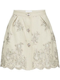 floral-jacquard high-waist miniskirt Reflecting its whimsical aesthetic, Giambattista Valli presents this miniskirt. Adorned with a floral jacquard motif, this romantic piece is finished with a scalloped hem. Highlights - Beige - Cotton blend - Floral detail - High waist - Front button fastening - Scallop hem Made in Italy Composition Cotton 50%, Viscose 40%, Polyester 10% Washing instructions Dry Clean Only