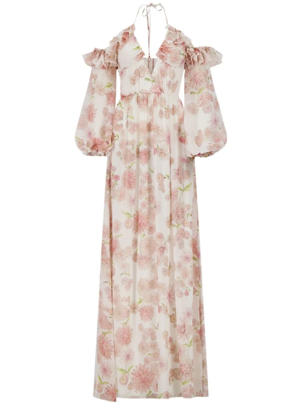 floral-print halterneck dress Presented as part of Giambattista Valli’s SS23 collection, this silk dress exists as an ode to Spring. The delicate floral print evokes the lively feeling of the season while the ruffled detailing adds a touch of volume to the silhouette. Made in Italy Composition Silk 100% SIZE & FIT Measurement CHEST 29.13 in(74 cm) HIPS 37 in(94 cm) LENGTH 62.2 in(158 cm) WAIST 25.98 in(66 cm)