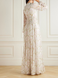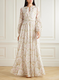 Giambattista Valli's gown embodies unapologetic femininity and modern romance. Made from weightless silk-georgette, it's patterned with pink flowers and has a gathered waist that balances the floaty skirt and billowy sleeves. Leave the ties at the keyhole neckline undone or fasten them into a bow. Size & Fit - Fits true to size, take your normal size - Designed to be slightly fitted at the bust and waist, loose at the hip - Lightweight, fluid, non-stretchy fabric - Model is 175cm/ 5'9" and is wearing an IT 40 Model measurements: - Bust: 78cm/ 31" - Waist: 62cm/ 24.5" - Hip: 92cm/ 36" Details & Care - Ivory, pink and green silk-georgette - Concealed zip fastening along side - 100% silk; lining: 55% cotton, 45% viscose - Fully lined - Dry clean