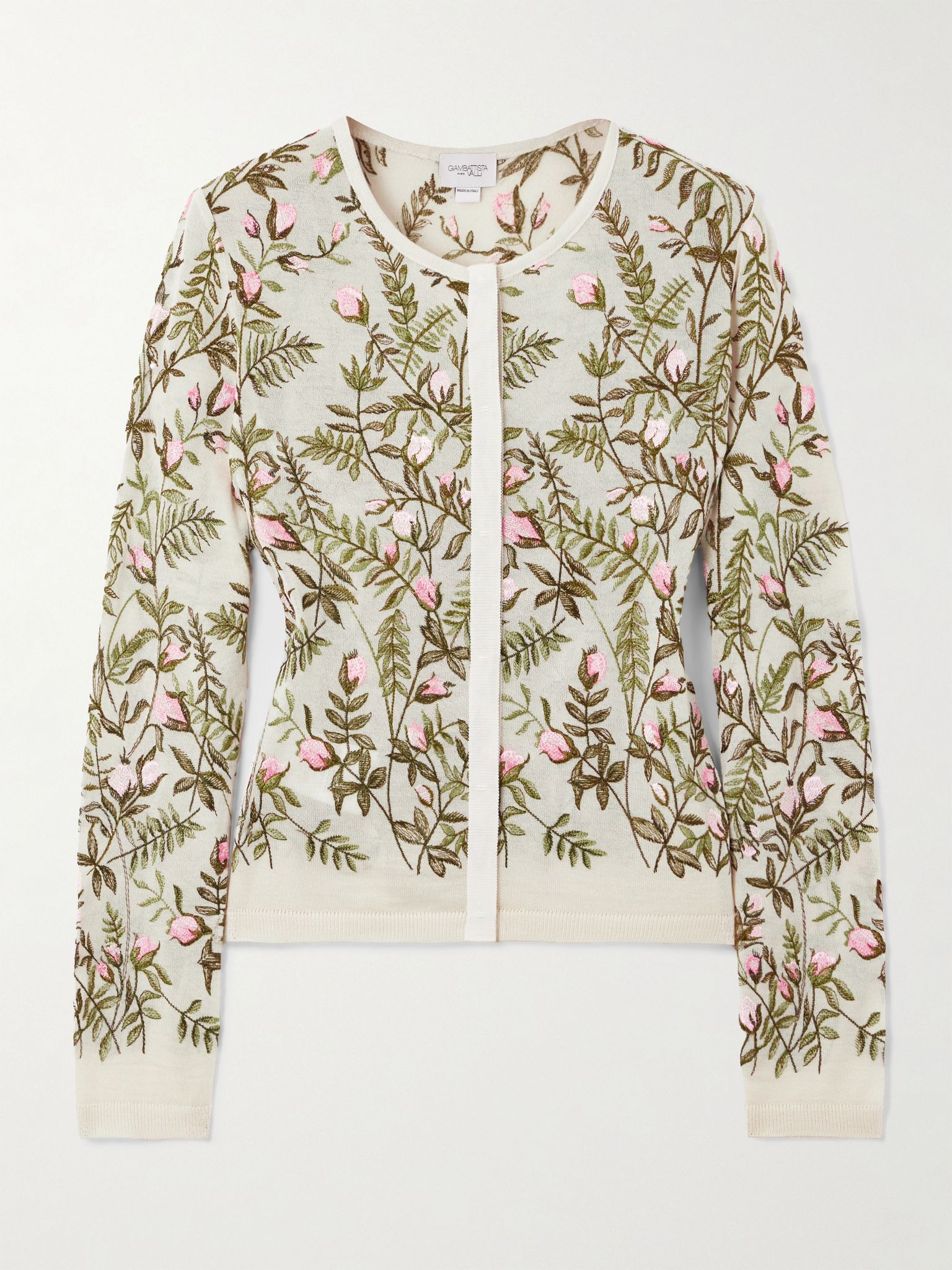 Giambattista Valli's cardigan is beautifully embroidered with budding roses, giving it a distinctly romantic feel. Knitted from a soft blend of cashmere and silk, it has a slim fit defined by ribbed trims too. Wear yours with skirts or tailoring alike. Size & Fit - Fits true to size, take your normal size - Designed for a slim fit - Lightweight knit - Model is 177cm/ 5'10" and is wearing an IT 40 Model measurements: - Bust: 80cm/ 31.5" - Waist: 60cm/ 23.5" - Hip: 89cm/ 35" Details & Care - Ivory cashmere and silk-blend - Concealed snap fastenings through front - 70% cashmere, 30% silk - Dry clean