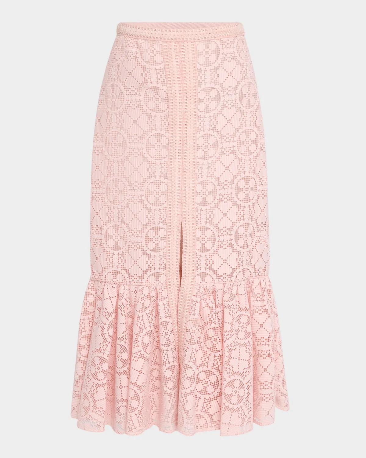 Giambattista Valli lace skirt featuring a ruffle flounce hem with a center-front slit High waist Hem falls below the knee A-line silhouette Invisible side zip Polyester Made in Italy
