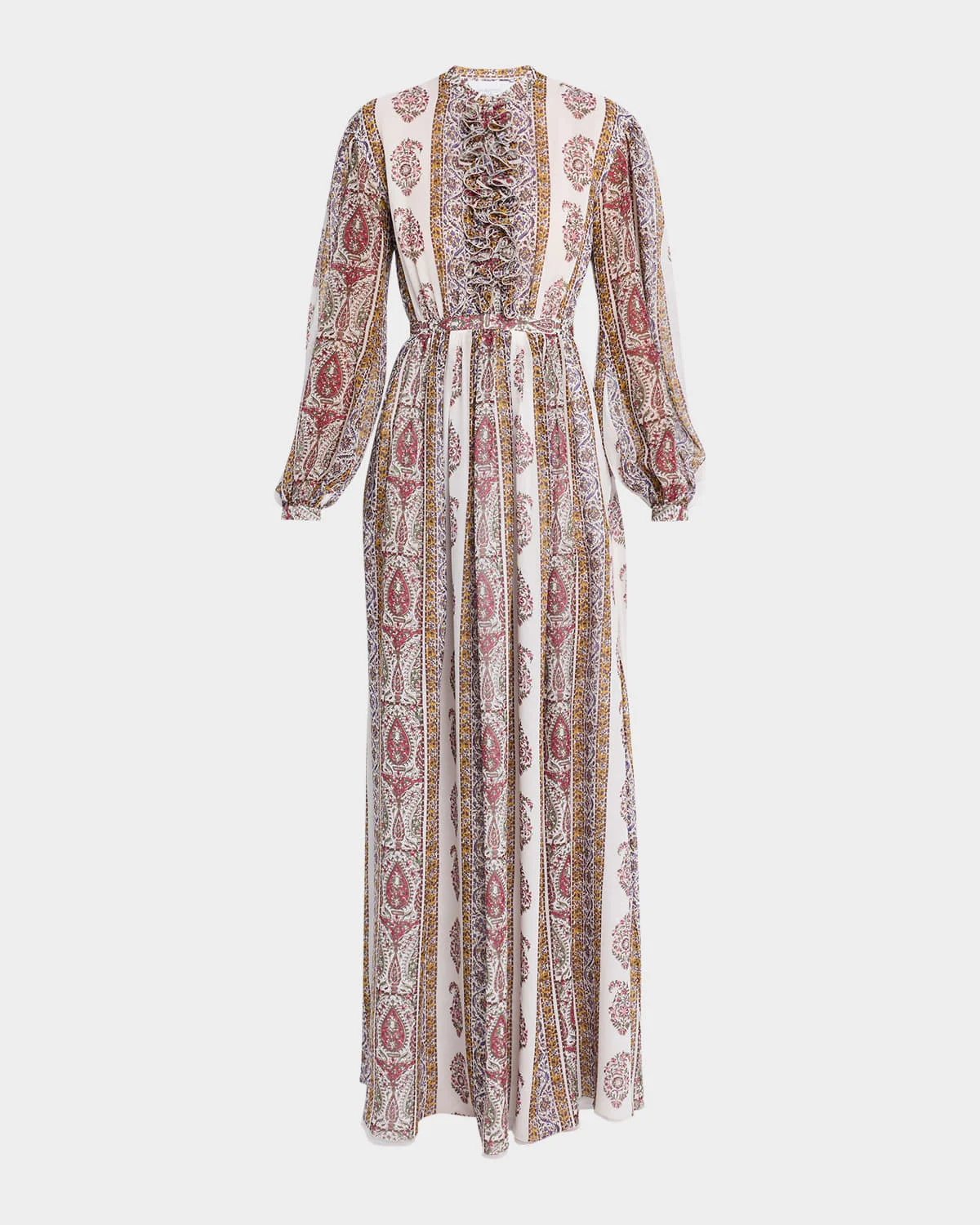 Long Bishop-Sleeve Paisley Silk Dress