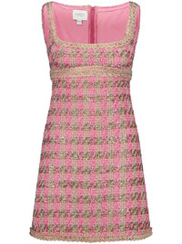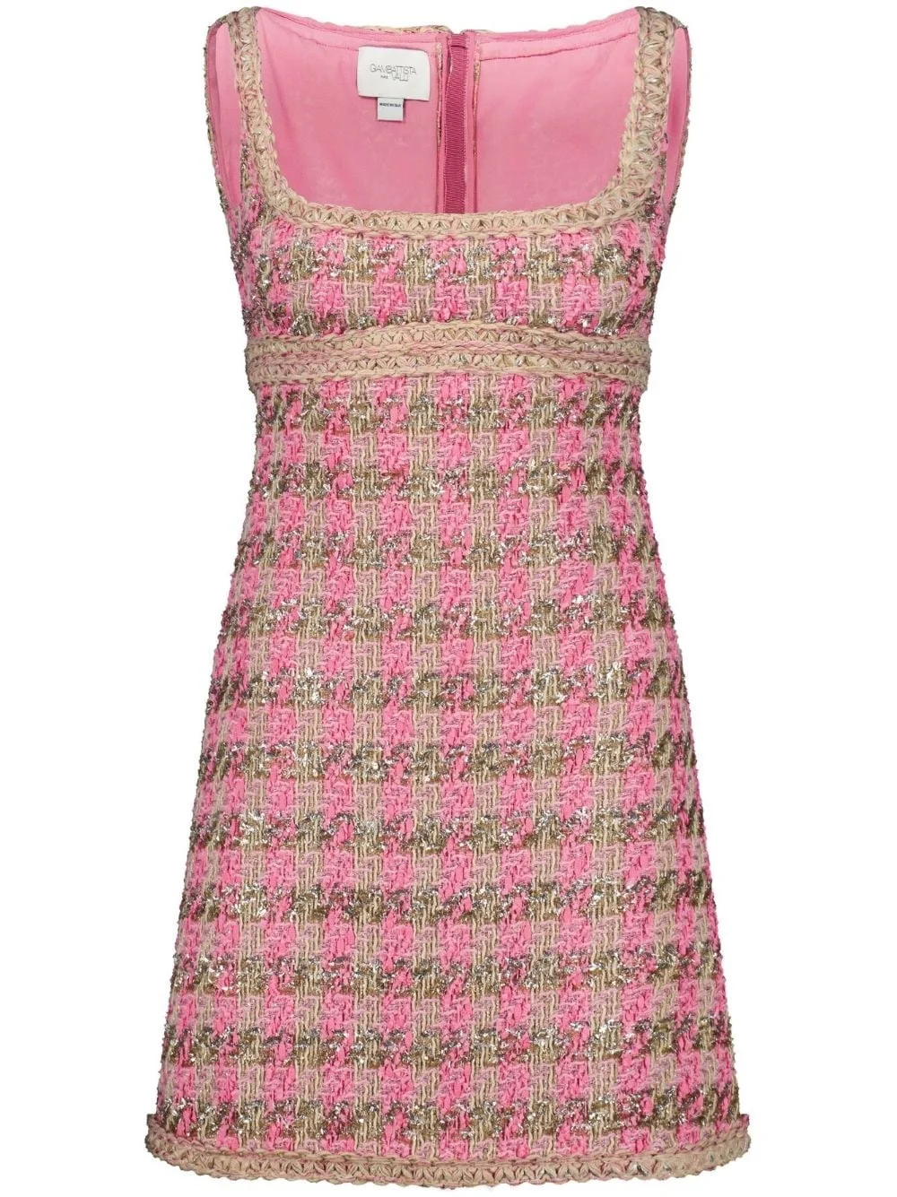 lurex tweed minidress Cut from pink and gold tweed, this Giambattista Valli minidress is detailed with a braided trim and shimmering lurex touches, showcasing the brand's romantic take on timeless silhouettes. Highlights - Flamingo pink - Lurex detailing - Tweed - Square neck - Sleeveless - Rear zip fastening - A-line skirt - Above-knee length - Straight hem Made in Italy Composition Outer: Polyamide 32%, Wool 28%, Cotton 17%, Polyester 12%, Viscose 10%, Other Materials 1% Lining: Silk 100% SIZE & FIT Measurement CHEST 33.07 in(84 cm) HIPS 36.61 in(93 cm) LENGTH 31.88 in(81 cm) WAIST 29.13 in(74 cm) Washing instructions Dry Clean Only