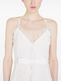 corded-lace sleeveless maxi dress Highlights - White - Corded lace - Ruffled trim - Bow detailing - V-neck - Spaghetti straps - Rear criss-cross straps - Sleeveless - Ankle-length - Concealed rear zip fastening Made in Italy Composition Polyester 100% Washing instructions Dry Clean Only