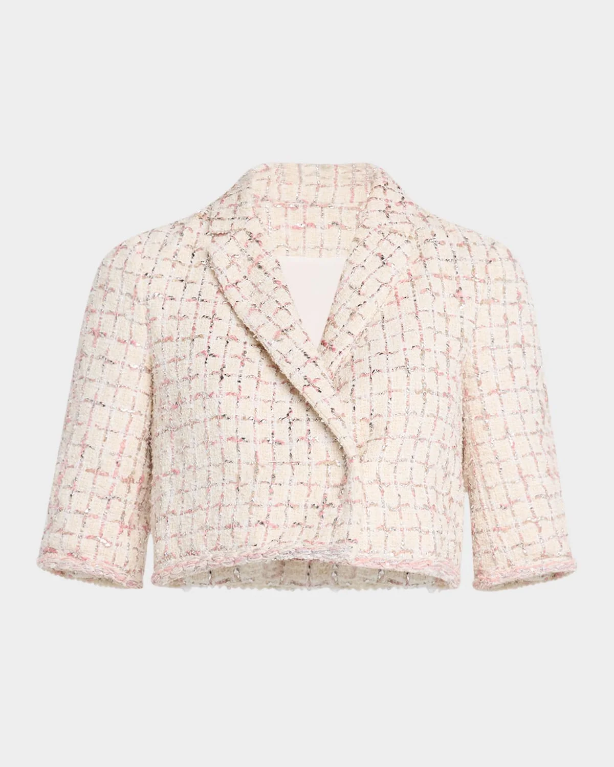 Giambattista Valli jacket in check metallic eyelash tweed Notch lapels; single-breasted front Short sleeves Straight fit Cropped length Snap closure Nylon/polyamide/nylon/polyamide/acrylic Made in Italy