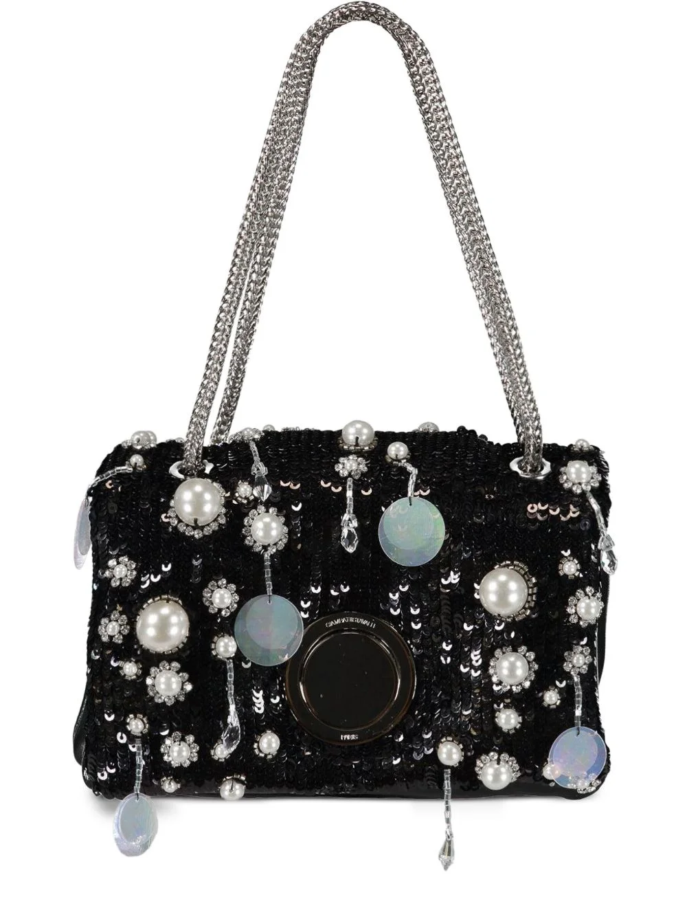 mini Airbag shoulder bag Highlights - Black - Sequin embellishment - Pearl embellishment - Metal chain strap - Circular cut-out detail - Dangling pearl accents Made in Italy Composition Outer: Polyamide 100% Lining: Lamb Skin 100% SIZE & FIT Measurement DEPTH 3.54 in(9 cm) HEIGHT 6.29 in(16 cm) WIDTH 7.48 in(19 cm)