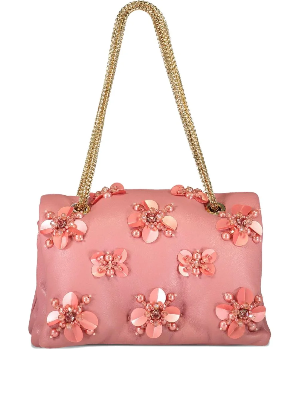 flower-embellished chain shoulder bag Highlights - Powder rose - Floral embellishment - Chain-link shoulder strap - Bead detailing - Gold-tone hardware Made in Italy Composition Outer: Lambskin 100% SIZE & FIT Measurement DEPTH 3.5 in(8.8 cm) HEIGHT 6.3 in(16 cm) WIDTH 7.5 in(19 cm)
