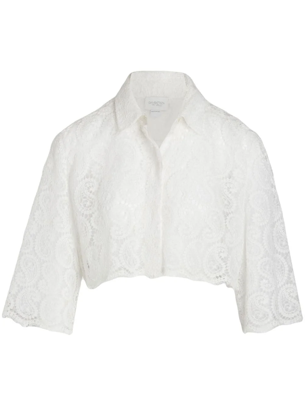 paisley-pattern macrame cropped blouse Giambattista Valli's cropped blouse is intricately patterned with a delicate paisley design and is complete with scalloped trims. Highlights - White - Cotton blend - Macrame detailing - Paisley print - Classic collar - Concealed front fastening - Half-length sleeves - Scallop hem - Cropped Made in Italy Composition Cotton 85%, Polyester 15% Washing instructions Dry Clean Only