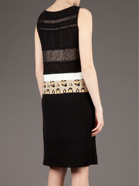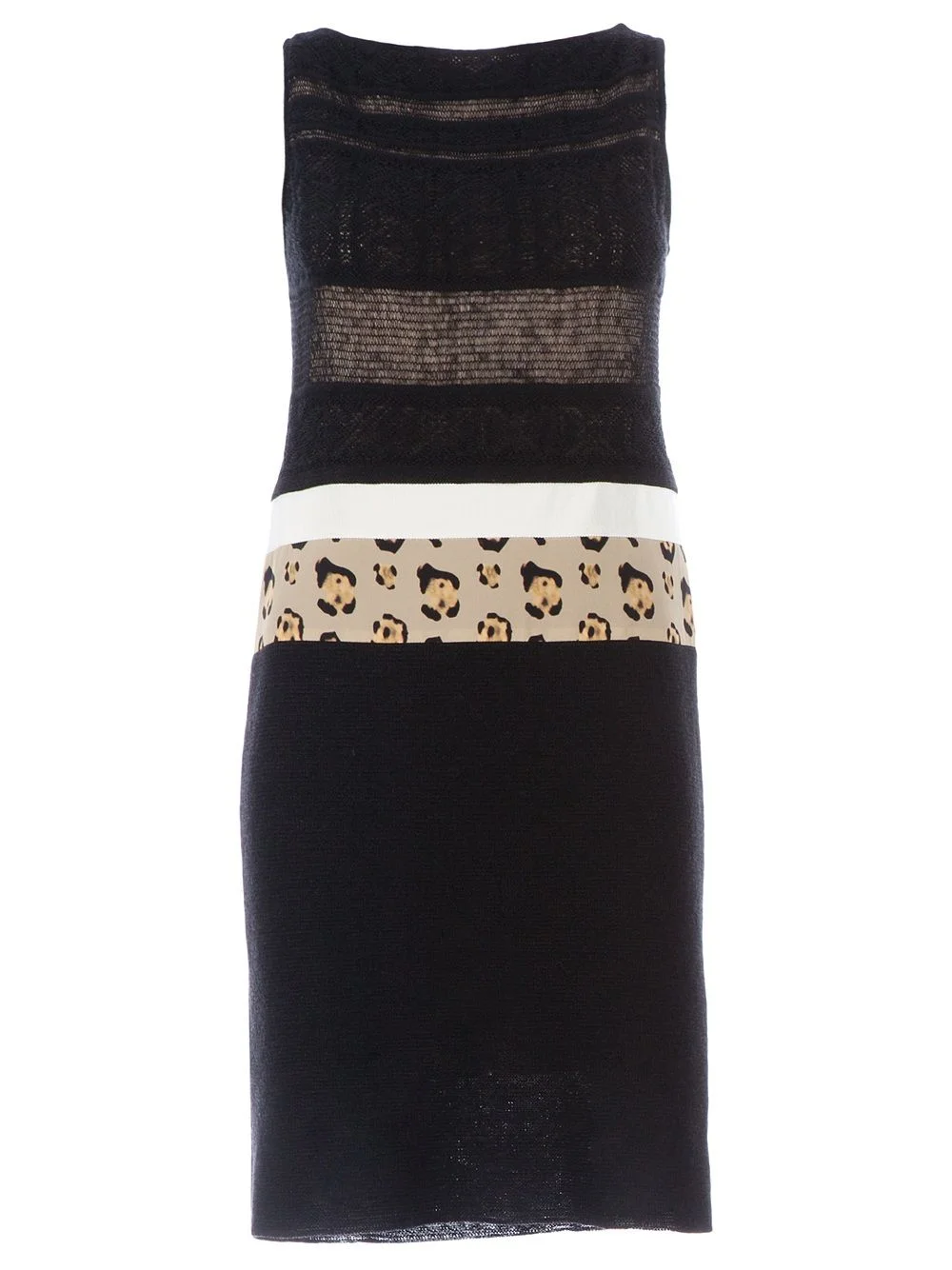 paneled dress Black linen blend sleeveless dress from Giambattista Valli featuring a slash neck, a fine knit patterned bodice, a white waist paenl, a leopard print waist panel and a knitted skirt section. Made in Italy Composition Outer: Linen/Flax 72%, Silk 15%, Cotton 13% Polyamide 86%, Viscose 50%, Spandex/Elastane 14% Lining: Silk 100% Washing instructions Dry Clean Only