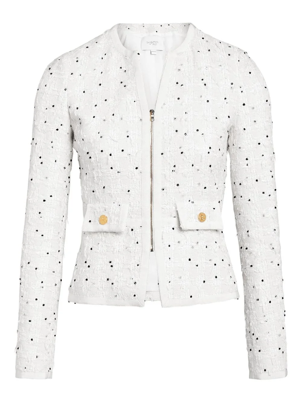 polka-dot boucle jacket Highlights - Ivory - Boucle texture - Polka dot pattern - Zip front fastening - Gold-tone buttons - Flap pockets Made in Italy Composition Cotton 63%, Polyamide 13%, Polyester 11%, Polyurethane 8%, Acrylic 2%, Other fibres 2%, Wool 1% Washing instructions Read Manufacturer Guidelines