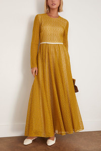 The Giambattista Valli Ribbon Macrame Dress in Mustard is a long sleeve maxi dress with macrame design and bow detail at the waist. FIT DESCRIPTION - Maxi length - Long sleeves - Crew neck - Concealed back zip closure - Lined - Bow detail at the waist - 100% Polyester