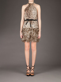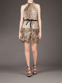 ruffled leopard print dress Tonal brown sleeveless leopard print silk blend dress from Giambattista Valli featuring a high neckline, a central pleat, a black bow detail at the waist, a layered ruffle skirt section and a concealed rear zip fastening. Made in Italy Composition Lining: Silk 100% Outer: Viscose 50%, Cotton 50% Washing instructions Dry Clean Only