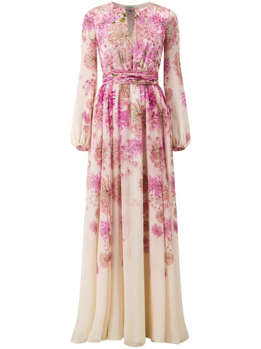 Saint-Remy silk maxi dress Giambattista Valli's signature Saint-Remy print adorns this romantic silk dress. Cinched in at the waist and fitted with long sleeves, it falls to a flowy floor-length skirt silhouette. Highlights - Rose pink - Silk - All-over floral print - Round neck - Front tie fastening - Keyhole neck - Long sleeves - Fitted waistline - Pleated skirt - Long length Made in Italy Composition Silk 100% Washing instructions Dry Clean Only